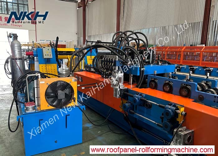 Compared to traditional c/z purlin roll forming machines, an interchangeable machine can works much more efficient, since it takes only 10 minutes at most to produce z steel purlins of a different size. Generally, a Z steel section channel roll forming machine usually consists of a manual de-coiler, feeding guide with leveling device, hydraulic punching tools, roll forming part, hydraulic cutting, transmission system, a PLC control cabinet, a hydraulic oil pump and run-out tables.
